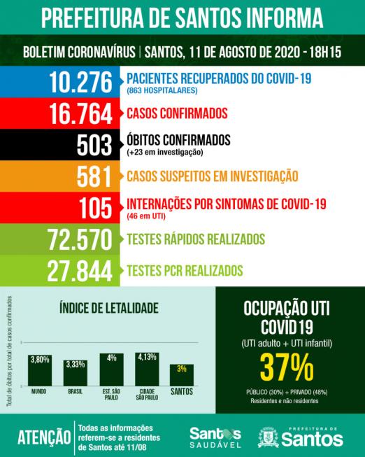 Diminuiu o número de pessoas com sintomas da covid-19 internadas em Santos. Na segunda-feira (10), havia 218 pacientes nos hospitais públicos e privados da Cidade e, nesta terça (11), são 214 (-1,8%). Do total, 109 são moradores de outros municípios (51%) e 105 residentes (49%).