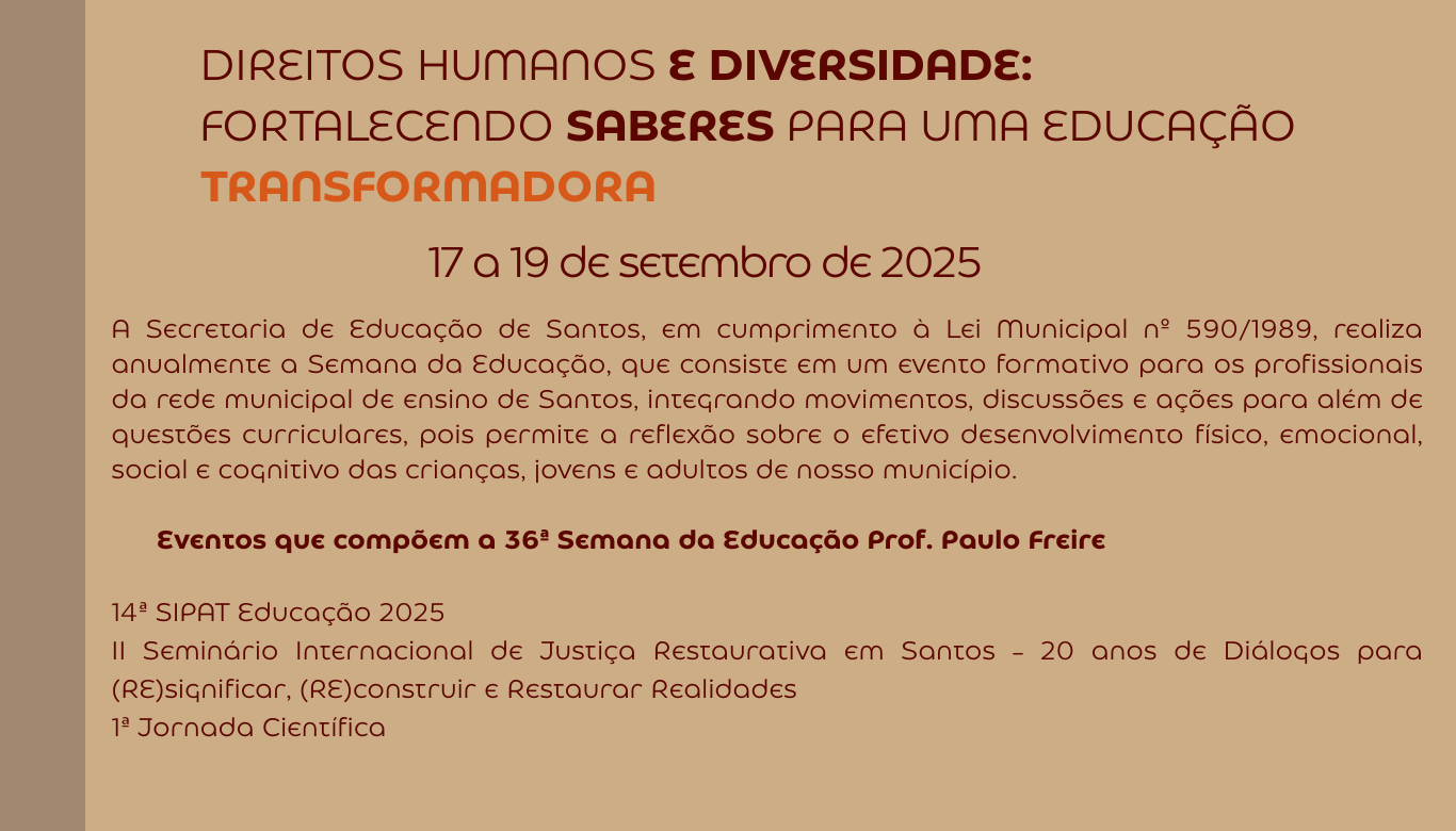 O Programa Municipal de Justiça Restaurativa de Santos, instituído em 2017, visa transformar relações e promover a cultura de paz nas escolas. O II Seminário Internacional de Justiça Restaurativa será realizado durante a 36ª Semana da Educação de Santos, reunindo especialistas e educadores para compartilhar experiências e reflexões sobre práticas restaurativas e cultura de paz.