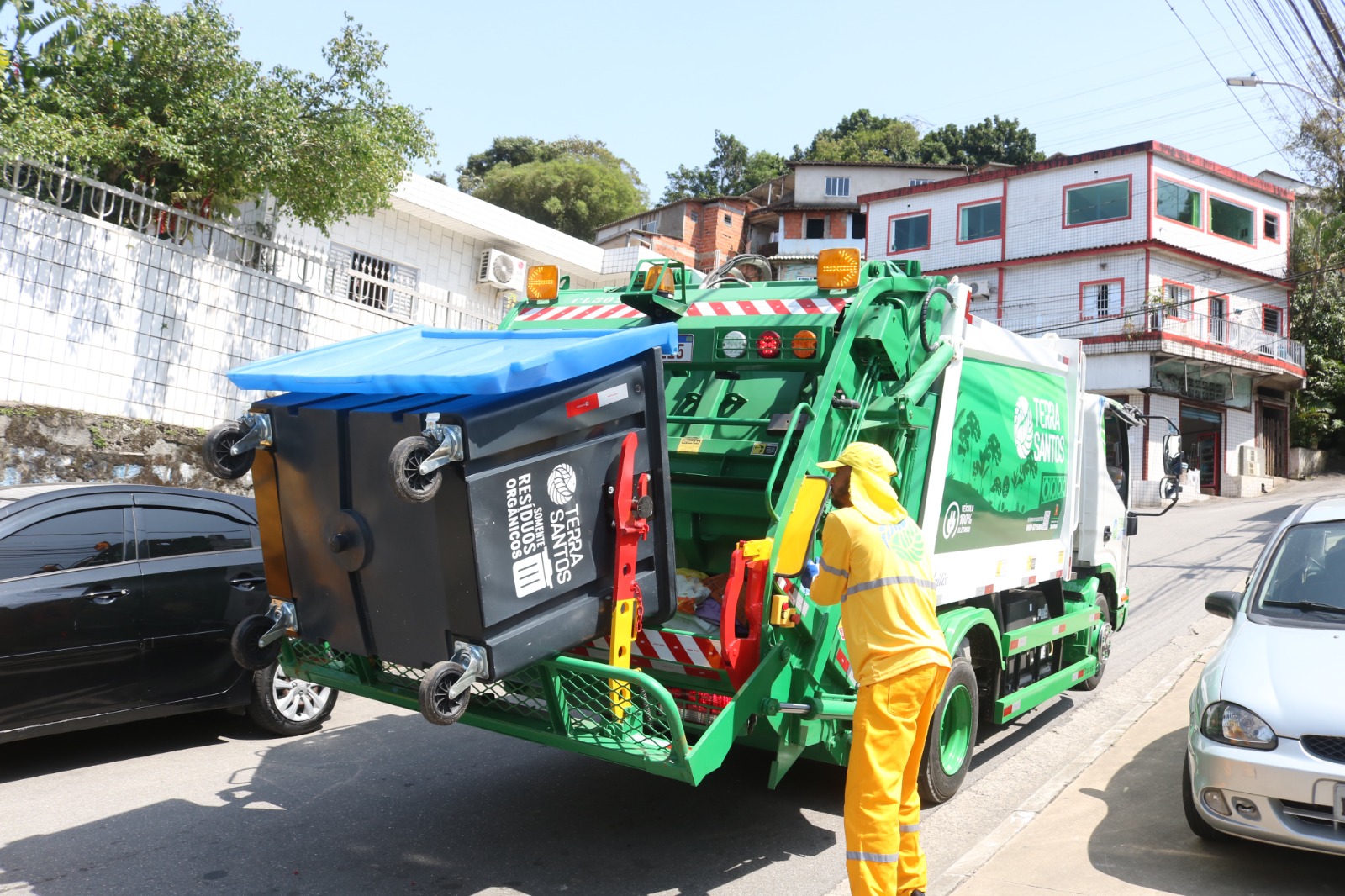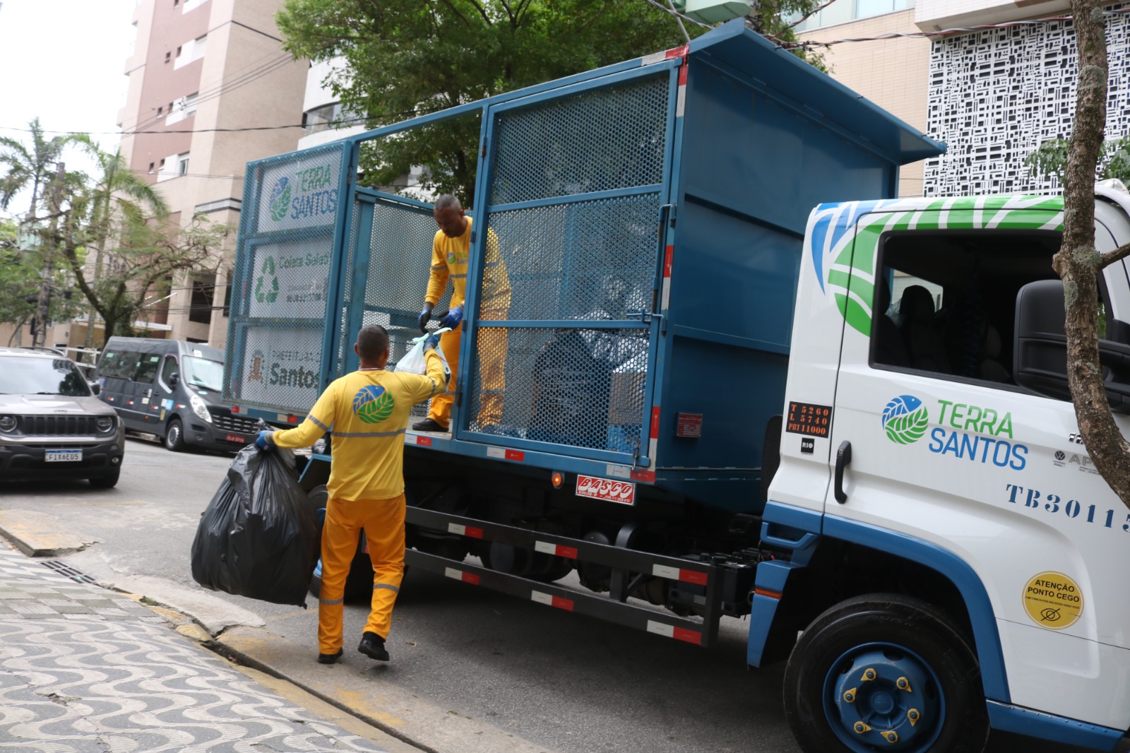 Os primeiros quatro caminhões elétricos já foram implementados na frota de veículos Terra Santos, que terá 10 dos caminhões a diesel sendo substituídos por veículos elétricos, com expectativa de reduzir em até 30% a emissão de carbono associado à coleta.