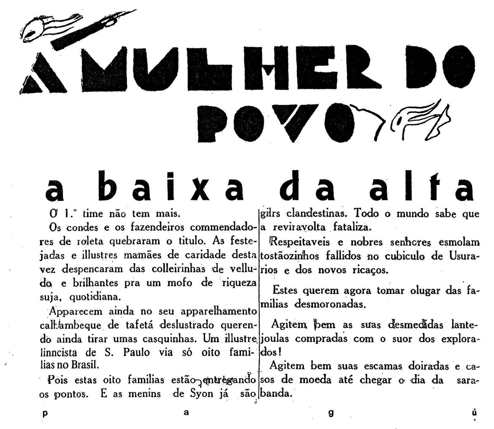 Patrícia Rehder Galvão (1910-1962), a Pagu, foi jornalista, escritora e militante política, figura marcante do modernismo e do Movimento Antropofágico, conhecida por sua atuação cultural e visão crítica e inovadora. Suas colunas e obras abordaram política, arte e questões sociais, com destaque para a defesa das mulheres e denúncias das injustiças sociais, como no Parque Industrial. Participou ativamente da luta ideológica e foi a primeira mulher presa por motivos políticos no Brasil, em Santos, em 1931. Incentivou o teatro e o jornalismo na Cidade, colaborando para a criação de entidades e para a construção do Teatro Municipal. Sua vida intensa e engajada refletiu a busca por transformação social e cultural, mantendo relevância até hoje.