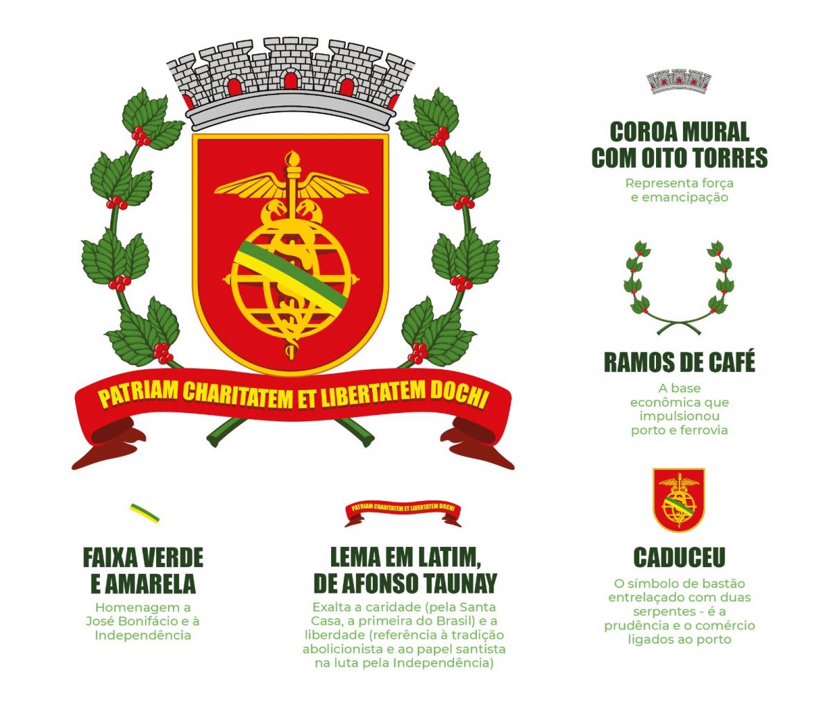 Criado por Benedito Calixto em 1920 e remodelado em 1925, o Brasão de Santos reúne símbolos da identidade histórica e econômica da Cidade. A coroa mural com oito torres representa força e emancipação; os ramos de café, a base econômica que impulsionou porto e ferrovia. O caduceu - símbolo com um bastão - é a prudência e o comércio ligados ao porto. A faixa verde e amarela, homenagem a José Bonifácio e à Independência. O lema em latim, de Afonso Taunay, exalta caridade - pela Santa Casa, a primeira do Brasil - e liberdade, referência à tradição abolicionista e ao papel santista na luta pela Independência.
