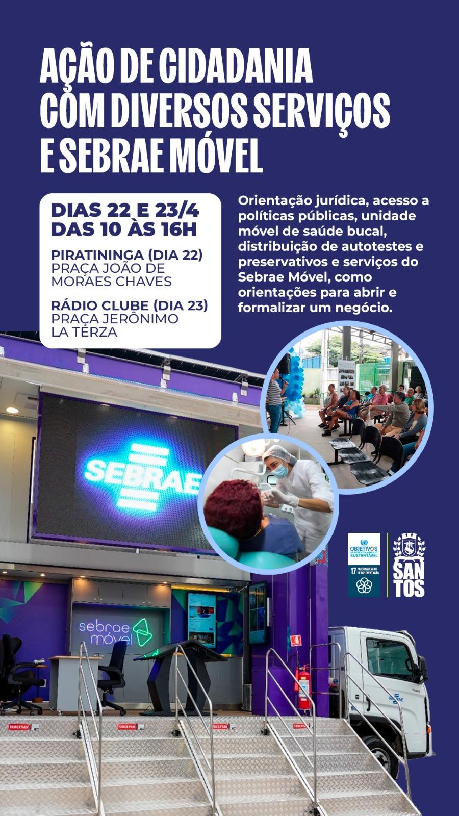 Santos promove, nesta quarta-feira (22) e quinta-feira (23), uma grande ação de cidadania nos bairros Piratininga e Rádio Clube, com oferta de serviços gratuitos, orientações e atendimento da unidade móvel do Sebrae. A iniciativa é realizada pela Secretaria da Mulher, Cidadania, Diversidade e Direitos Humanos (Semulher) da Prefeitura de Santos, e ocorrerá das 10h às 16h, com foco na ampliação do acesso da população às políticas públicas.