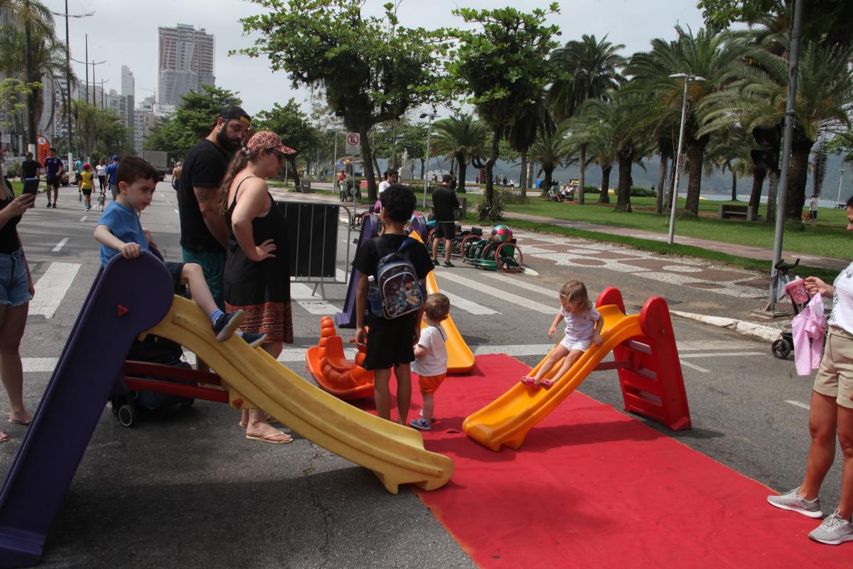 Na avenida da praia, o trecho entre a Avenida Ana Costa e a Rua Ricardo Pinto, na faixa sentido José Menino/Ponta da Praia, ficou fechado para os carros e se transformou em um grande parque durante a edição especial do Vem pra Orla, entre 10h e 14h.