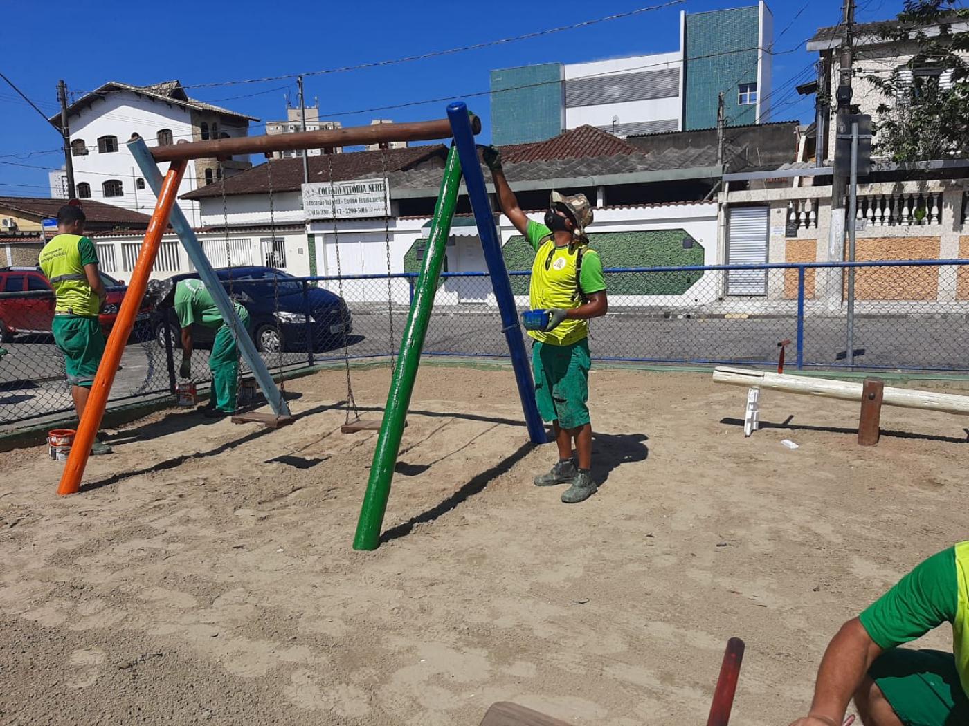 A calçada lateral da escola municipal Prof. José de Sá Porto está sendo reformada, enquanto outros pontos do bairro passam por raspagem, capinação de vias e praças, reforço na limpeza das ruas e pontos de descarte, manutenção dos playgrounds, poda de árvores, recapeamento de ruas e limpeza na rede de drenagem.