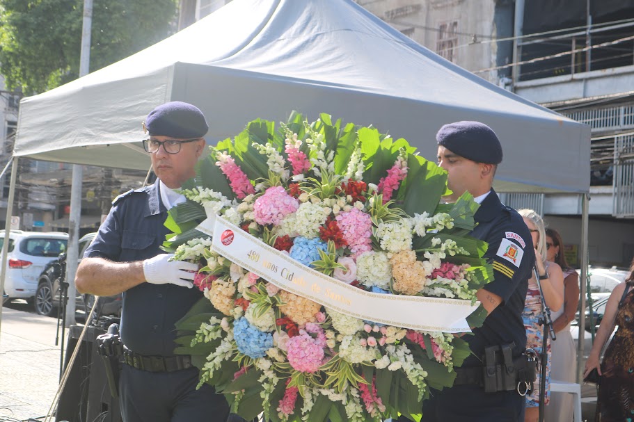 O primeiro compromisso do dia foi o ato cívico na Praça da República, no Centro Histórico. A cerimônia contou com a execução dos hinos Nacional e de Santos, seguida da deposição de flores no monumento a Braz Cubas, fundador da Vila de Santos.