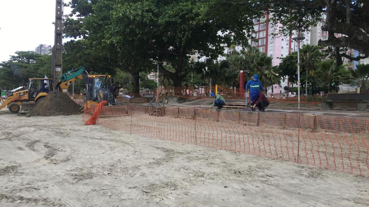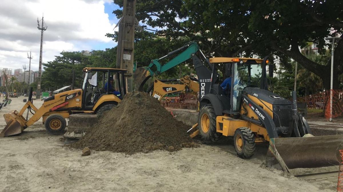 Calçadão da orla de Santos recebe estacas para garantir mais estabilidade
