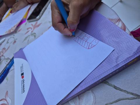 M., 42 anos, tem dois filhos e sente-se segura no equipamento. Conta que sofreu muita violência junto com os filhos de 6 e 14 anos. Na 'Carta para o futuro', ela desenhou uma casa. “Quero um lar seguro para mim e meus filhos”.