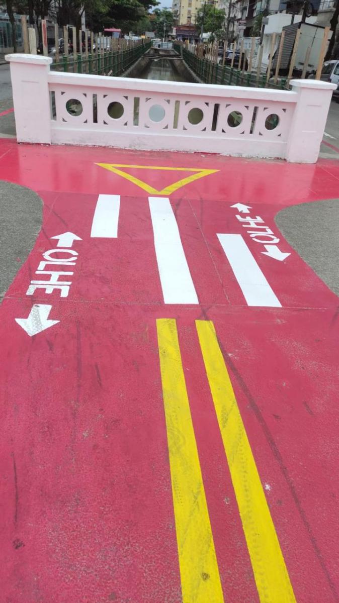 Já os trechos danificados dos guarda-corpos metálicos foram substituídos por tubos de aço galvanizado e toda a superfície metálica recebeu tratamento e pintura esmalte. A etapa final envolveu pintura do guarda-corpo e da ciclofaixa, além da substituição dos tachões refletivos que norteiam o trânsito das bicicletas.