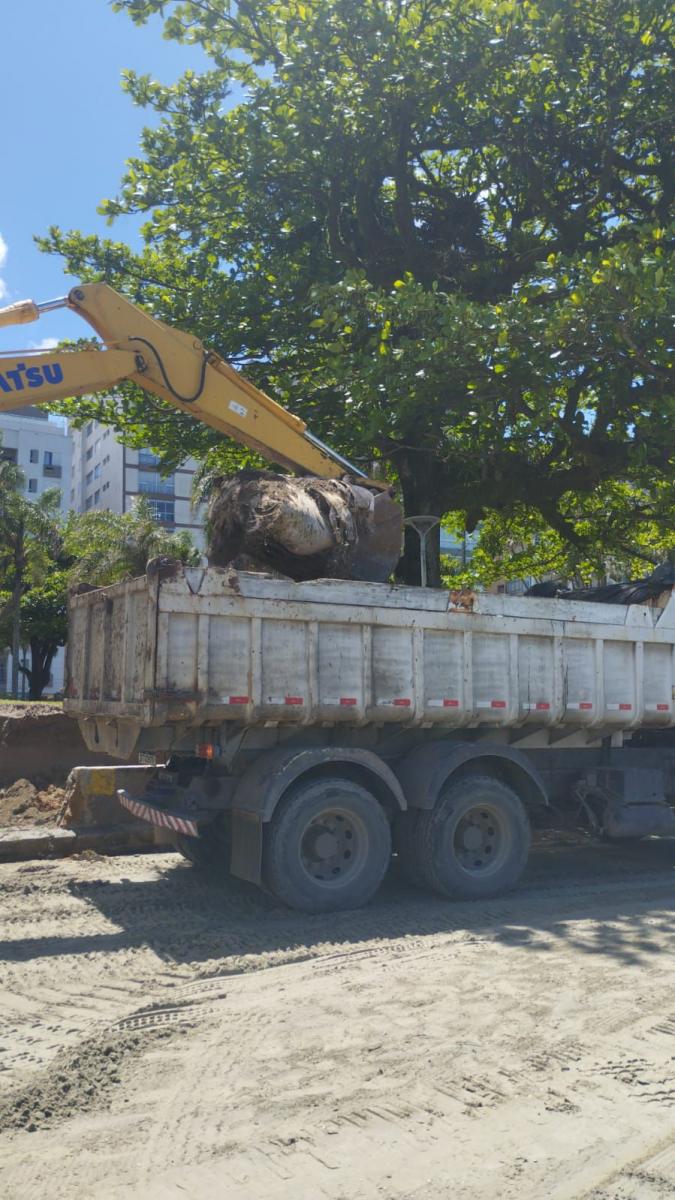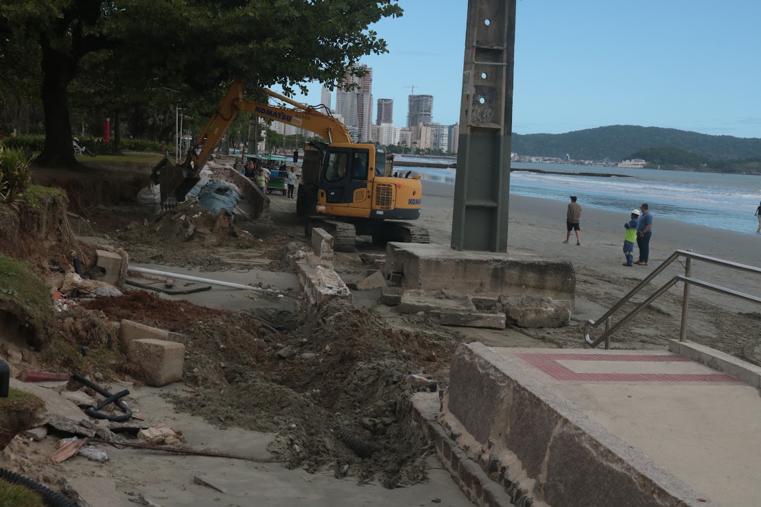 Foram iniciados nesta terça-feira (21) os trabalhos de reconstrução da calçada junto à faixa de areia, em frente à Avenida Bartolomeu de Gusmão, nas praias do Embaré e Aparecida, que sofreu forte erosão durante a ressaca de 29 de julho, com danos ao passeio, muretas e bancos.