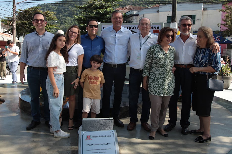 A entrega do espaço revitalizado contou com a presença de André Monteiro de Fazio, filho do homenageado com o nome da praça, e outros familiares (abaixo).