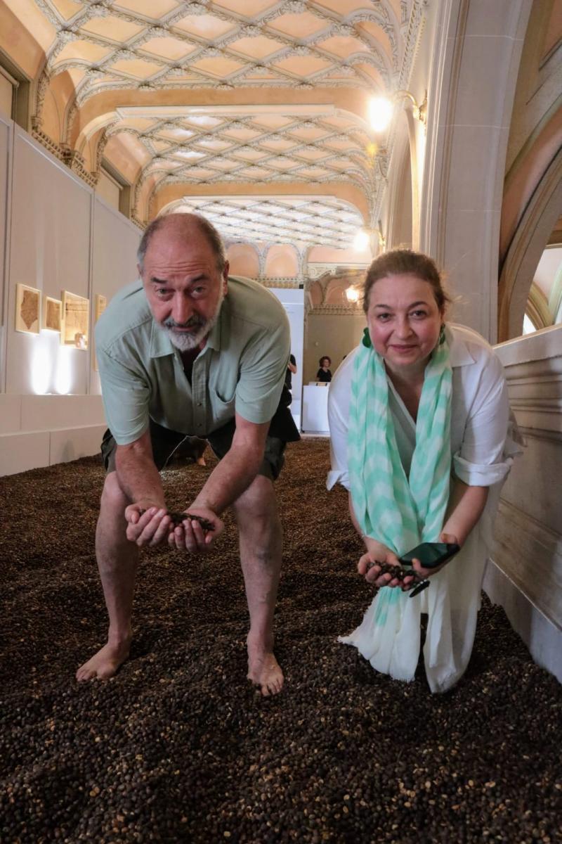 Convite aceito pelo casal Juan Ruiz, 76 anos, e Selma Gaspar, 52 anos. Apreciadores da bebida, eles vieram de São Paulo especialmente para acompanhar a abertura da exposição. A recomendação foi feita por uma artista plástica amiga deles e a dica foi aprovada. Eles conheceram o trabalho de Raquel pisando sobre grãos de café coquinho. “Eu achei maravilhosa a ideia. Sou amante do café. Adoro. E acho que é uma conexão maior com a natureza. Está mexendo com os sentidos, é uma questão sensorial. Tem aroma e essa coisa de tirar o sapato é importante, porque não é só tirar o calçado, é tirar outras coisas também, como o orgulho, e estar mais conectada consigo mesma. Valeu a pena”, diz Selma.
