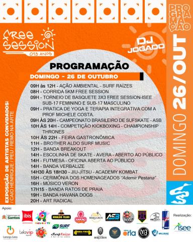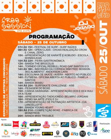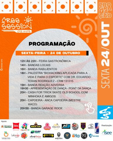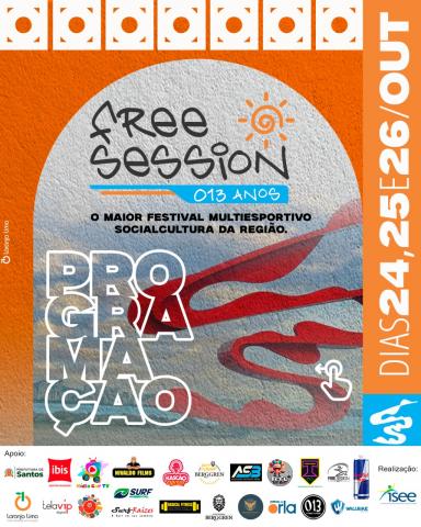 Um encontro promovendo muito esporte e cultura para o público vai agitar Santos, sexta-feira (24), sábado (25) e domingo (26). Completando 13 anos, o Festival Free Session 013 oferecerá no Novo Quebra-Mar, no José Menino, uma programação variada desde o caratê até canoas havaianas e surfe, além de shows musicais e ação social.