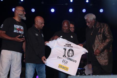 Mais tarde, um outro instante que arrebatou corações foi o show de Tony Tornado. Acompanhado do filho Lincoln e banda Funkessência, Tony surgiu no palco como um verdadeiro vendaval — firme, vibrante e gigante. A cada música, sua voz carregava luta, vivência e orgulho. No meio da apresentação, o cantor recebeu uma surpresa: uma camisa do Santos FC, entregue pelas lendas do futebol Abel e Edu. Tony não se segurou e chorou abraçado aos seus ídolos.