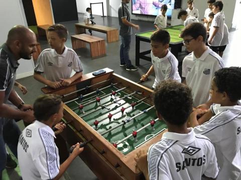 Os meninos terminaram a visita no espaço interativo do museu, onde se divertiram com o chute a gol, nas mesas de pintura e disputando partidas de pebolim e de futebol de botão.