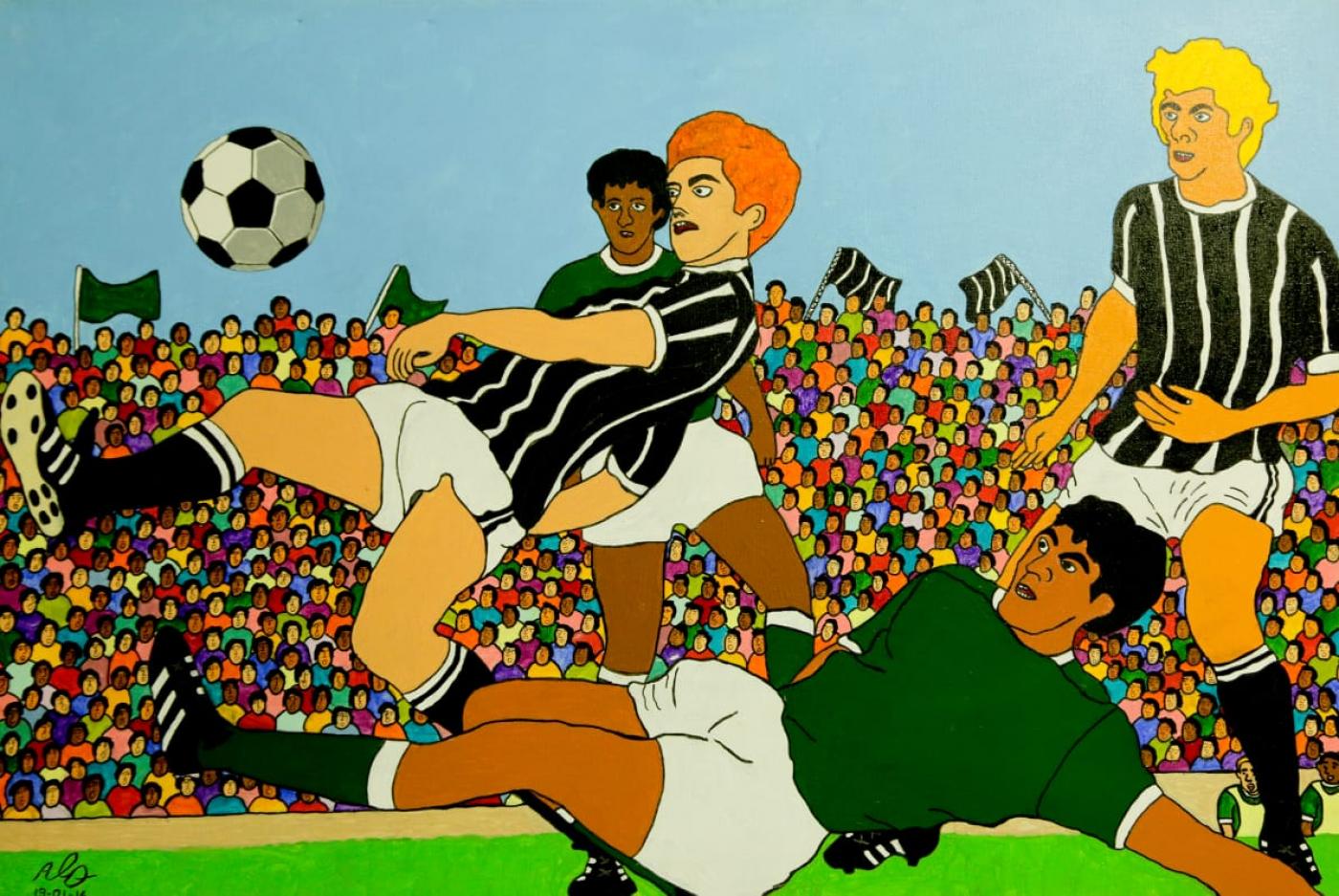 O artista apresenta a bola em três dimensões: no modelo Telstar, da Adidas, a primeira bola oficial usada na Copa do Mundo FIFA, que estreou em 1970; em lances documentados por fotógrafos da época e em uma torcida naïf, presente nos desenhos do autor quando criança, época em que publicava revistinhas desportivas artesanais como repórter de campo de várzea.