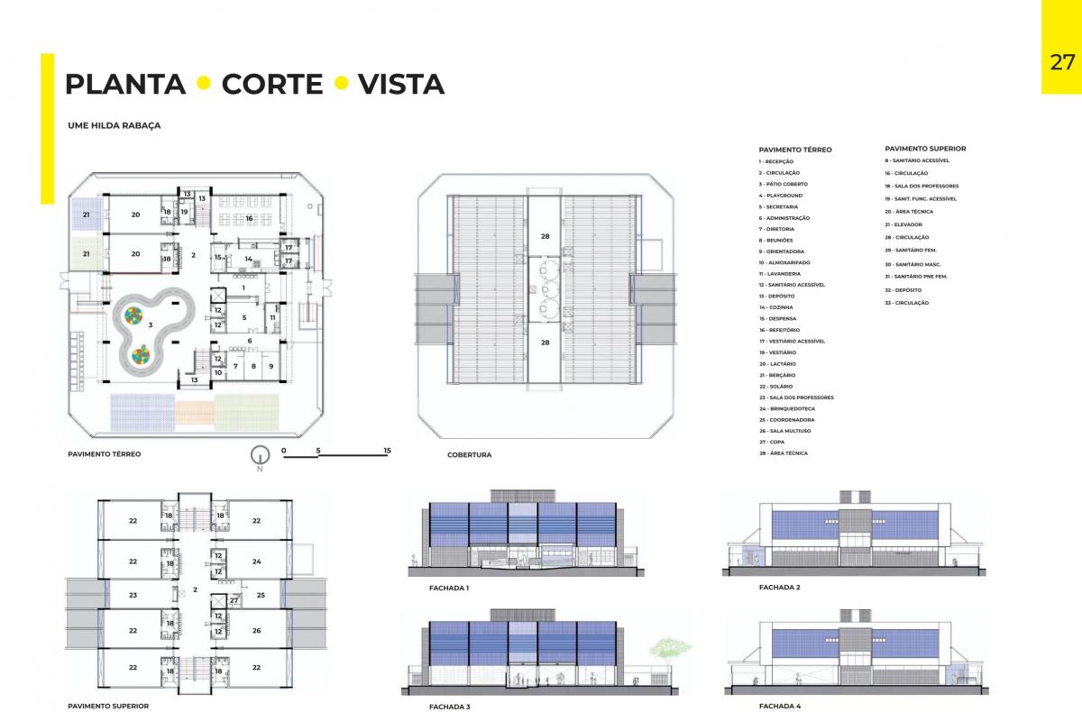 No andar superior ficarão seis salas de aula com vestiário, brinquedoteca, sala dos professores, sanitários e uma sala multiuso. A escola contará com acessibilidade por meio de elevador, escadas com corrimãos e barras de apoio, e comunicação visual. Está prevista ainda climatização para toda a unidade.