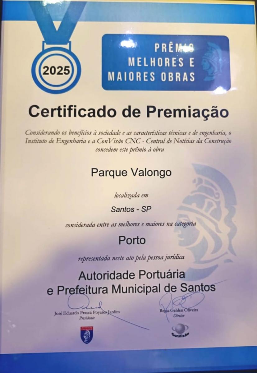 Revitalização da faixa portuária do Centro Histórico de Santos e sua integração com a Cidade, a obra do Parque Valongo foi selecionada para receber o Prêmio Melhores e Maiores Obras 2025, na categoria Porto. A premiação, concedida pelo Instituto de Engenharia, foi entregue na terça-feira (21), durante a Semana Nacional de Engenharia, em São Paulo.