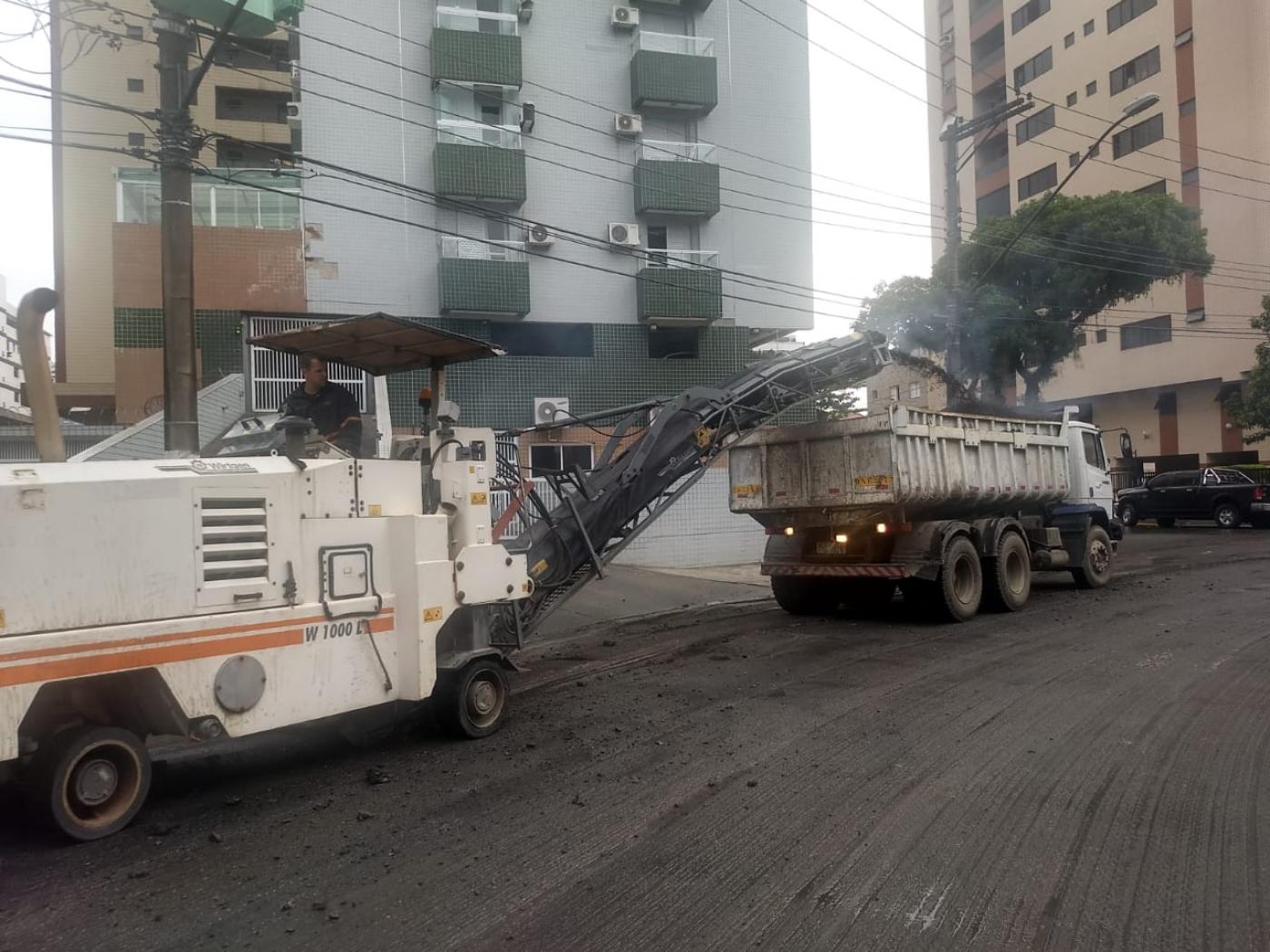 Um conjunto de dez ruas do bairro Aparecida passa por obras que somam quatro quilômetros de pavimentação. Metade delas já foram recapeadas e outras cinco estão sendo preparadas para a nova camada de asfalto. Nesta terça-feira (24) operários finalizam a raspagem do asfalto antigo da Praça Nossa Senhora Aparecida.