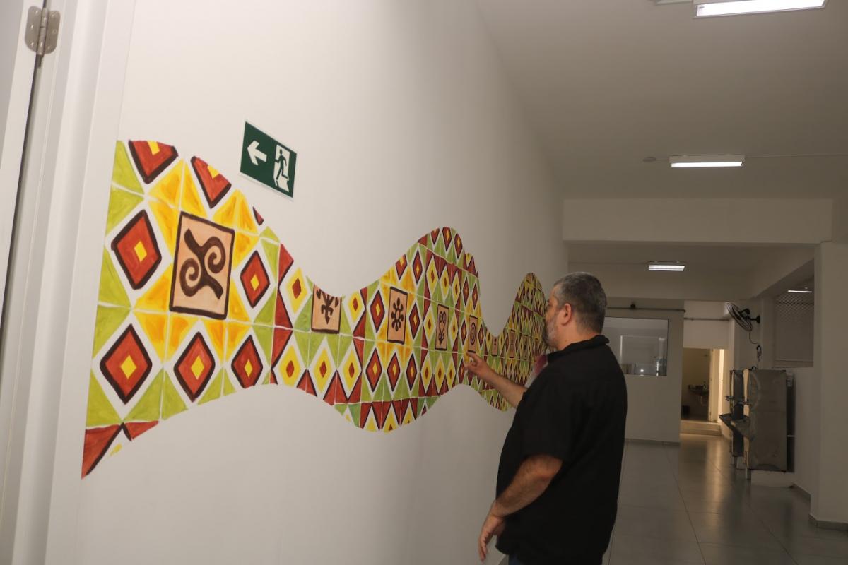 As paredes também incorporam elementos temáticos de acordo com cada sala: na Justiça Restaurativa, cores e símbolos associados ao tema; em outros trechos, motivos afro-brasileiros com símbolos Adinkra; e, mais adiante, referências indígenas. Tudo pintado à mão, em um conjunto que acolhe e informa. "A intenção era que cada professor se sentisse tocado e representado. Não é só estética, é educação também", explica.