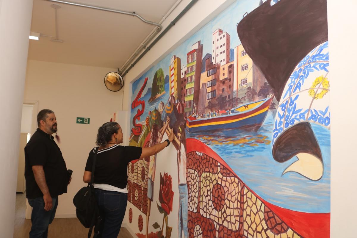 Já o mural do primeiro andar celebra a Santos contemporânea. Cenas do cotidiano, prédios tortos, praias, o emissário submarino, a catraia, tão presente na rotina de educadores que atravessam diariamente e diversos elementos compõem a narrativa visual. Ao centro, duas crianças protegem uma flor, representando ao mesmo tempo fragilidade, renovação e esperança. A referência surge de uma releitura inspirada na obra Guernica, de Picasso.