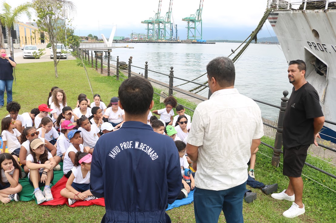 Cerca de 50 alunos dos 3º, 4º e 5º anos da UME João Papa Sobrinho (Gonzaga) conheceram navio Professor Wladimir Besnard, primeira embarcação brasileira a chegar ao continente antártico e atualmente uma das atrações do Parque Valongo, nesta quarta-feira (3), durante atividade de estudo do meio do Projeto Antártica na Escola.