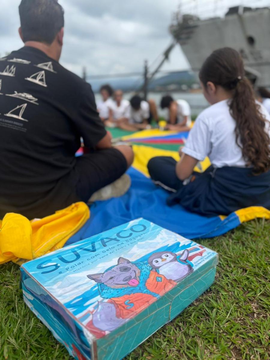Antes de conhecerem mais sobre a embarcação, os alunos participaram de uma roda de histórias sobre a Antártica, baseada no livro Suvaco Polar - Com gelo na bagagem,  das autoras Jana Del Favero e Dra. Fran.
