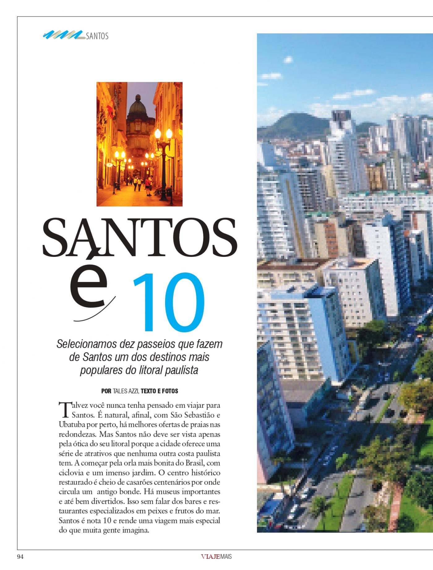 Com texto e imagens do editor-chefe Tales Azzi, a matéria tem como título ‘Santos é 10’ e conta com chamada na capa sobre “10 motivos para conhecer as atrações de Santos”. No texto de abertura, o editor-chefe ressalta que Santos “não deve ser vista apenas pela ótica de seu litoral, porque a Cidade oferece uma série de atrativos que nenhuma outra da costa paulista tem”. Na sequência: “E começa pela orla mais bonita do Brasil, com ciclovia e imenso jardim. O Centro Histórico é cheio de casarões centenários por onde circula antigo bonde. Há museus importantes e até bem divertidos”. E, finalizando o texto, “Santos é nota 10 e rende uma viagem mais especial do que muita gente imagina”.