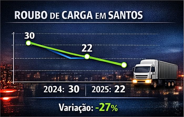 Diminuiu também o número de roubos de cargas, com 22 casos em 2025 e 30 em 2024 (-27%).