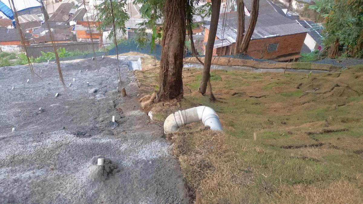 Sob a geomanta, foi aplicada terra vegetal em 172,52m³ para o plantio de grama em placas, de forma a recompor o terreno.