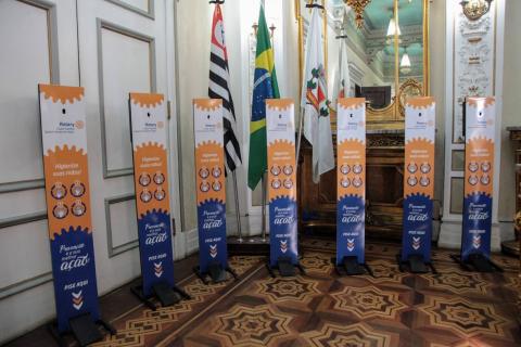 Santos recebeu, nesta terça-feira (30), sete totens para aplicação de álcool em gel por meio de pedal, que evitam o contato das mãos com o dispenser. Os equipamentos foram doados pelo Rotary Clube Satélite Santos Oeste em Ação e serão instalados nas unidades de pronto atendimento (UPAs) e em policlínicas da Cidade.