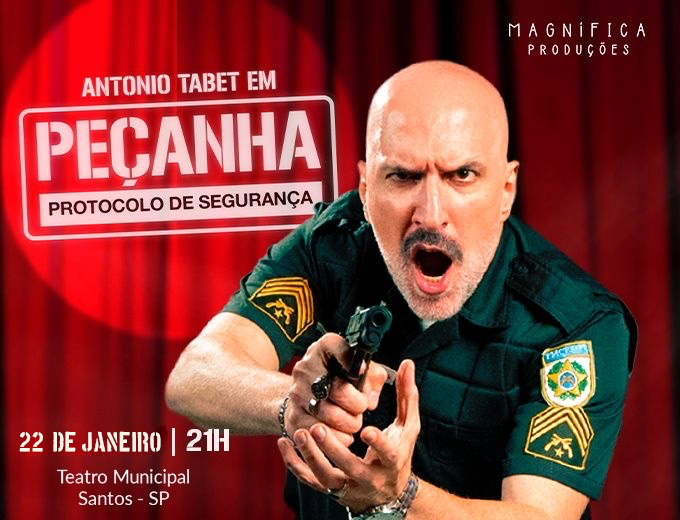 Depois do sucesso de público em sua última apresentação na Cidade, o espetáculo ‘Tenente Peçanha’ está de volta no dia 15 de janeiro, abrindo a temporada de humor de 2026. O ator, humorista e criador de conteúdo Antônio Tabet, um dos fundadores do programa ‘Porta dos Fundos’, interpreta o icônico policial Tenente Peçanha, o policial mais politicamente incorreto e amado da internet. Com seu estilo direto, sarcasmo afiado e críticas sociais embaladas com piadas certeiras, o personagem conquista plateias por onde passa, apresentando um show vibrante, inteligente e cheio de situações hilárias.